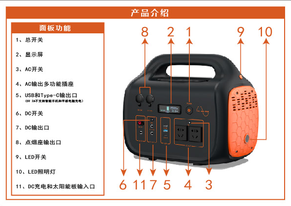 - DC पावर सप्लाई अन गर्नुहोस्: (1) मुख्य पावर स्विचको नम्बर 1 बटनमा क्लिक गर्नुहोस् (2) DC स्विचको नम्बर 6 बटनमा क्लिक गर्नुहोस् (3) DC पावर सप्लाई सुरु गर्नुहोस्। प्रत्यक्ष वर्तमानमा सिगरेट लाइटर, DC5525, USB, PD समावेश छ